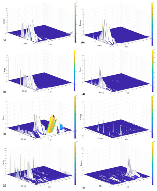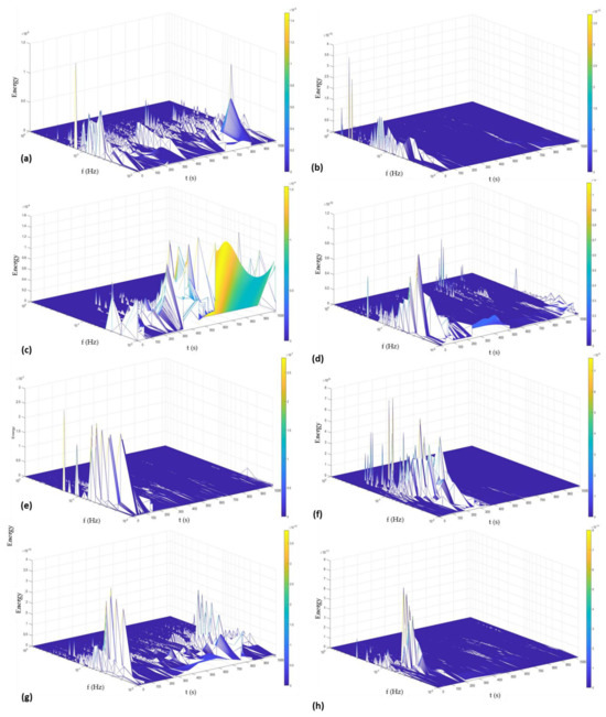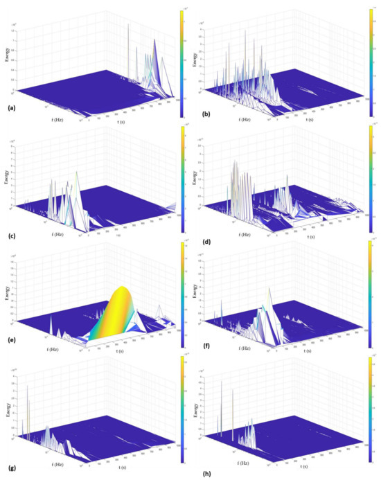 Finally, Figure 12 shows the Hilbert spectra of AM 350 alloys passivated at 49 °C. The behavior of this passivation is very similar to the behavior shown in Figure 11. However, Figure 11a–d show the results for passivation in citric acid, and those samples presented a greater energy accumulation at high frequencies. For that reason, the passivated citric acid has a higher trend of presenting localized corrosion.