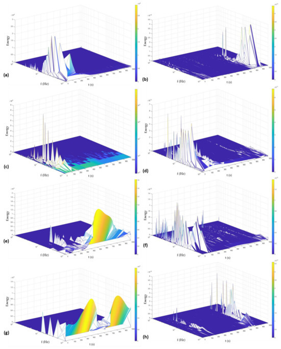 Hilbert spectra for Custom 450 samples passivated at 25 °C in citric acid (a–d) and nitric acid (e–h) and exposed to NaCl (a,c,e,g) and H2SO4 (b,d,f,h). (a,b,e,f) were passivated for 60 min; (c,d,g,h) were passivated for 90 min.