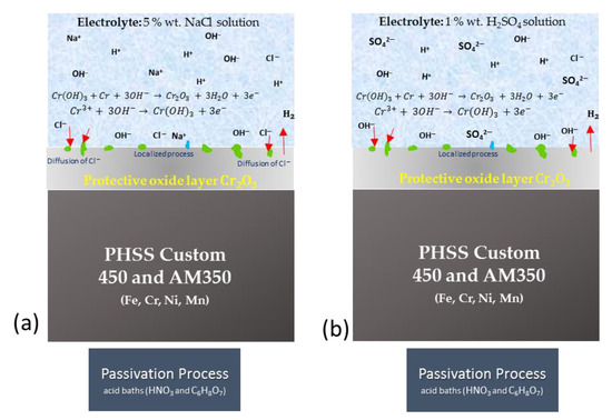 Recent studies on corrosion in stainless steels have concentrated on real steel. Little research has been conducted on PHSSs. Thus, it is critical to understand electrochemical corrosion in the electrolytes that are often used in airplanes, such as in industrial, urban, and marine environments [39,40].