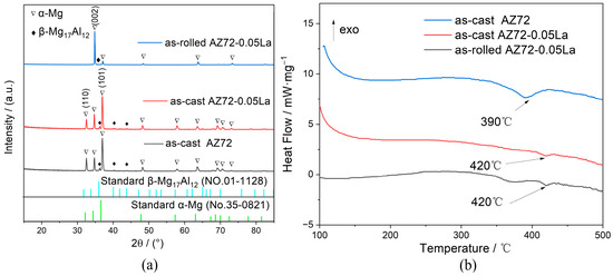 The XRD patterns of the magnesium alloys are shown in Figure 2a. The analysis of the XRD patterns revealed that both the AZ72 and AZ72-0.05La alloys are predominantly composed of an α-Mg phase and a β-Mg17Al12 phase. Figure 2b presents the differential scanning calorimetry (DSC) analysis results for the three alloys. As seen in Figure 2b, there is an endothermic peak at ~400 °C, corresponding to the eutectic transformation α-Mg+Mg17Al12→L1. This further confirms that the three alloys primarily consist of an α-Mg phase and a β-Mg17Al12 phase. It is noteworthy that in the study by Wu et al. [23], an Al11La3 phase was detected in the XRD patterns of AZ61-0.5La alloy; however, no new phases were observed after the addition of La in this experiment. This may be due to the relatively small amount of the rare earth La added, meaning that the content of the new phase is below the lower limit of the XRD detection resolution. By using the XRD refinement method, the volume fractions of each phase in the magnesium alloys were estimated. The volume fractions of the β-Mg17Al12 phase in the as-cast AZ72 alloy and AZ72-0.05La alloy were ~4.43% of ~4.68%, respectively. After rolling, the crystal orientation changes significantly. According to the XRD analysis, the peak intensity of (101) on the crystal surface of the magnesium alloy is highest (2θ ≈ 36.619°), and the peak with the highest intensity changed to the (002) plane (2θ ≈ 34.398°) after rolling. Simultaneously, the peak (2θ ≈ 32.193°) corresponding to the (110) crystal plane disappears, indicating that the as-rolled sample has a strong texture. In addition, the diffraction peak of the β-Mg17Al12 phase with a network structure is noticeably weakened after the rolling treatment, indicating a reduction in the content of this phase.