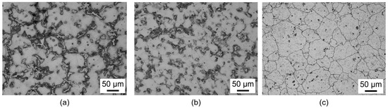 Figure 3 displays the microstructure of the as-cast AZ72 and the as-cast and as-rolled AZ72-0.05La alloys. The microstructure of the as-cast AZ72 and as-cast AZ72-0.05La alloys is primarily dendritic, with the second phase distributed in dendrite gaps and grain boundaries [24]. Figure 3a shows the microstructure of the as-cast AZ72 alloy, in which the magnesium alloy grains show a relatively larger size, and the β-Mg17Al12 phase is discontinuously distributed on the grain boundaries of the α-Mg matrix, forming a discontinuous network structure. The eutectic compounds in the as-cast magnesium alloys show an obvious segregation phenomeon at grain boundaries, resulting in an uneven internal structure. Figure 3b demonstrates the effect of the trace La addition to the as-cast AZ72 alloy in the second phase, β-Mg17Al12. After the trace La addition, the second phase becomes more uniform and refined, laying the foundation for enhancing the discharge voltage and energy density of the battery. Figure 3c illustrates the microstructure of the AZ72-0.05La alloy after rolling. After rolling, the grain boundaries of the AZ72-0.05La alloy become clearer, and the β-Mg17Al12 phase becomes much smaller. The second phase is integrated with the matrix, and the aggregation phenomenon near the grain boundary is significantly weakened, with only a small amount of the second phase remaining in the grain boundary and crystal. This ordered metallographic structure is beneficial to the improvement of the anode discharge performance of AZ72-0.05La [25].