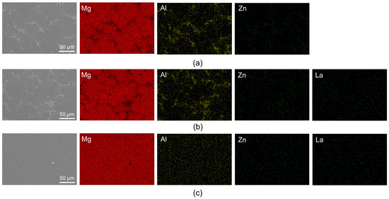 Figure 4 shows the SEM backscattered electron images and corresponding EDS spectra of the as-cast AZ72, as-cast AZ72-0.05La, and as-rolled AZ72-0.05La alloys. It can be observed from Figure 4a,b that the second phase precipitates in a discontinuous network and chain shape along the grain boundaries, and there are some coarse rod-like regions with poor Mg and rich Al, as seen in the EDS spectra. Combined with the XRD and metallographic analysis, these regions correspond to the β-Mg17Al12 phase. Upon addition of the 0.05 wt.% La, the dendritic area increased and became refined, resulting in a more continuous network. Post-rolling, the β-Mg17Al12 phase fractured and dispersed in the alloy in granular form. Additionally, the Zn and La elements were distributed relatively evenly in the alloy, with no obvious segregation observed in the EDS elemental mapping. The decrease in the content of the β-Mg17Al12 phase after rolling is consistent with the results obtained from the metallographic and XRD analysis.