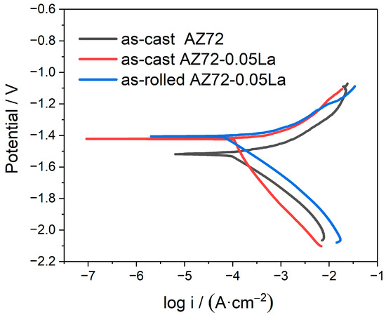 The potentiodynamic polarization (Tafel) curves of the three Mg alloys were tested in a 3.5% NaCl solution, and the results are shown in Figure 5. The relevant corrosion parameters are shown in Table 2. A Tafel curve consists of two parts: the cathode branch and anode branch. The anode branch is mainly related to the dissolution of the magnesium anode, while the cathode branch is mainly related to the hydrogen evolution reduction reaction on the surface of the magnesium anode [26]. The Tafel curve of the anode branch is complicated due to the complexity of anode corrosion behavior. In addition, the Tafel curve of the anode branch is controlled by concentration polarization under the condition of strong polarization, which makes it difficult to analyze the anode branch in detail. The self-corrosion potential (Ecorr) is the metal potential measured in the absence of an impressed current in a particular corrosion system. The more positive the self-corrosion potential, the smaller the corrosion current density, indicating a reduced tendency to corrosion and improved corrosion resistance. As can be seen from Table 2, the corrosion current densities of the as-cast AZ72-0.05La and as-rolled AZ72-0.05La are 155 μA·cm−2 and 205 μA·cm−2, respectively, which are lower than the corrosion current densities (262 μA·cm−2) of the as-cast AZ72 alloy. With a higher volume fraction of the β-Mg17Al12 phase in the as-cast AZ72-0.05La alloy compared with the as-cast AZ72 alloy, the ‘barrier effect’ of the β-Mg17Al12 phase becomes more pronounced after adding 0.05 wt.% La. A higher volume fraction of β-Mg17Al12 is beneficial for hindering the corrosion of α-Mg. In contrast, the as-rolled AZ72-0.05La alloy exhibits a negative shift in corrosion potential and an increase in corrosion current density, indicating decreased corrosion resistance. This is attributed to the deformation of the alloy lattices, leading to stress concentration at the grain boundaries and promoting intergranular corrosion.