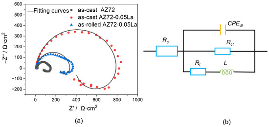 The corrosion behavior of the three anode materials was studied using the electrochemical impedance technique. Figure 6 shows the Nyquist diagram, where each EIS measurement includes a high-frequency capacitor loop and a low-frequency loop. The diameter of the high-frequency and low-frequency loops reflects the corrosion resistance of the magnesium alloy, and the large capacitance loop at a high frequency is associated with double electric layer capacitance at the electrode/electrolyte interface and charge transfer process [27]. Comparatively, the as-cast AZ72-0.05La magnesium alloy exhibits better corrosion resistance than the as-cast AZ72 magnesium alloy. Furthermore, the activity of the AZ72-0.05La increases and the corrosion resistance decreases after rolling. To further elucidate the reaction mechanism, the EIS data were fitted with an equivalent circuit using ZsimpWin software (ZsimpWin 3.6, Ann Arbor, MI, USA), as depicted in Figure 6b.