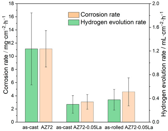 Figure 7 shows the hydrogen evolution and self-corrosion rates of the three alloys in a 3.5% NaCl solution. The specific parameters are shown in Table 4. There is a potential difference between the β-Mg17Al12 phase and α-Mg matrix, in which the α-Mg matrix and β-Mg17Al12 phase are the anode and cathode, respectively. Galvanic corrosion occurs between the α-Mg matrix and β-Mg17Al12 phase. As depicted in Figure 7, the self-corrosion rate and hydrogen evolution rate of the as-cast AZ72 alloy are 11.12 ± 5.47 mg·cm−2·h−1 and 1.24 ± 0.30 mL·cm−2·h−1, respectively. Upon incorporating 0.05 wt.% La, a significant reduction is observed in the self-corrosion rate and hydrogen evolution rate, measuring 2.70 ± 1.34 mg·cm−2·h−1 and 0.34 ± 0.12 mL·cm−2·h−1. After rolling, the self-corrosion rate and hydrogen evolution rate increases a little to 3.40 ± 1.57 mg·cm−2·h−1 and 0.51 ± 0.24 mL·cm−2·h−1 for the as-rolled alloy, respectively. Notably, the measured values exhibit significant fluctuation, attributed to the relatively heterogeneous microstructure (grain size, β-Mg17Al12 phase, Figure 3 and Figure 4) of the magnesium alloys. The β-Mg17Al12 phase undergoes refinement and homogenization upon introduction of the La element. Simultaneously, the discontinuous strip structure is transformed into a more continuous network structure. This network structure exhibits an enhanced corrosion resistance in a 3.5% NaCl solution, leading to a reduced self-corrosion rate in the magnesium alloy anodes. The addition of the La element also acts as an inhibitor of the NDE (negative difference effect) [29]. After rolling, the second phase undergoes refinement while the grain structure is transformed from dendrites to equiaxed crystals. Deformation leads to an increase in the grain boundary area, enhancing the probability of corrosive medium infiltration into the alloy. Furthermore, the alteration in the grain boundaries may elevate the alloy’s corrosion sensitivity.