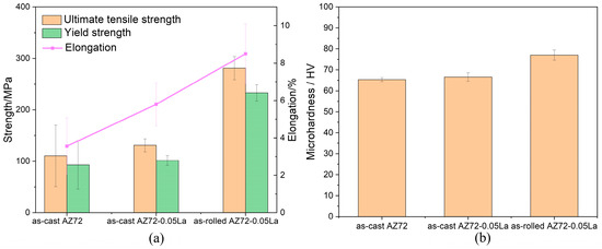 Mechanical performance testing was conducted on the magnesium alloys. From Figure 8a, it can be seen that there is little variation in tensile strength and yield strength between the as-cast AZ72 and as-cast AZ72-0.05La alloys, but there is a significant improvement in elongation. Compared with the as-cast AZ72 and as-cast AZ72-0.05La alloys, the as-rolled AZ72-0.05La alloy exhibits improved yield strength and tensile strength, along with a noticeable enhancement in elongation. The tensile strength, yield strength, and elongation of the as-rolled AZ72-0.05La alloy were 281 MPa, 233 MPa, and 8.50%, respectively. Figure 8b shows the hardness values of the three alloys. The as-cast AZ72 magnesium alloy had a hardness value of 65.34 HV, while the as-cast AZ72-0.05La magnesium alloy and as-rolled AZ72-0.05La alloy had hardness values of 66.60 HV and 77.06 HV, respectively. The addition of a small amount of La to the as-cast AZ72-0.05La alloy resulted in minimal change in hardness compared with the as-cast AZ72 alloy. However, the as-rolled AZ72-0.05La alloy exhibited a significant increase in hardness.