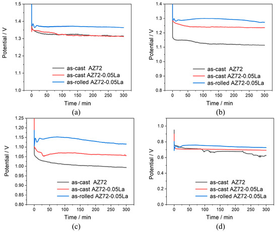 Discharge curves of the investigated anodes in 3.5 wt % NaCl solution at current density of: (a) 2.5 mA·cm−2, (b) 5 mA·cm−2, (c) 10 mA·cm−2, (d) 20 mA·cm−2.