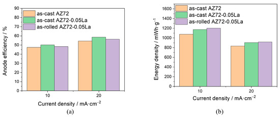 - At a high current density of 20 mA·cm−2, the as-rolled AZ72-0.05La alloy has a discharge voltage of 0.74 V and an energy density of 918 mWh·g−1, which are 6% and 3% higher than the as-cast AZ72-0.05La alloy, respectively. In addition, the as-rolled AZ72-0.05La alloy possesses a relatively low corrosion rate of 0.51 mg·cm−2·h−1, showing good comprehensive discharge performance.