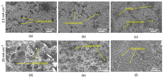 The surface morphologies of as-cast AZ72 (a,d), as-cast AZ72-0.05La (b,e), and as-rolled AZ72-0.05La (c,f) alloy after the removal of discharge products. The experiments were conducted in a 3.5 wt% NaCl solution for 5 h, with discharge current density of 2.5 mA·cm−2 (a–c) and 20 mA·cm−2 (d–f).