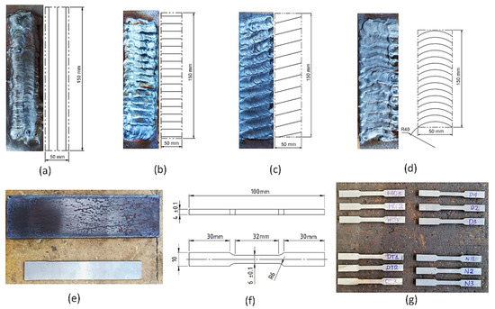 The LOM movement strategies and samples: (a) straight-profile, (b) short-profile, (c) cross-profile, (d) curved-profile, (e) steel lamination, (f) ASTM E8/E8M-13 standards sample, and (g) tensile test samples after wire EDM cutting.