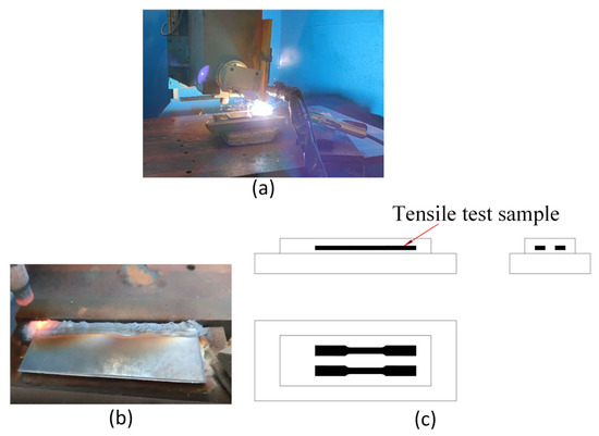 The LOM equipment and sample position: (a) CNC machine with TIG gun, (b) LOM process, and (c) tensile test sample position.