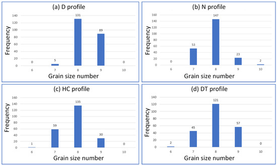 Grain size number distribution following ASTM E112-10 grain size number standard of the LOM samples with different movement strategies: (a) straight-profile, (b) short-profile, (c) cross-profile, and (d) curved-profile.