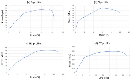 Stress–strain diagrams of LOM samples of fracture surface after tensile test with different movement strategies: (a) straight-profile, (b) short-profile, (c) cross-profile, and (d) curved-profile.