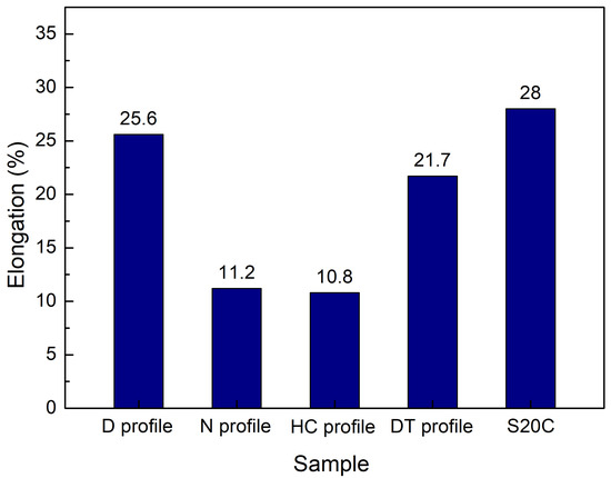 Figure 8 displays the average elongation of LOM samples of fracture surface after a tensile test with different movement strategies. The average elongation values of LOM samples are 25.6%, 11.2%, 10.8%, and 21.7%, corresponding to LOM samples of straight-profile, short-profile, cross-profile, and curved-profile, respectively. Different from the UTS value, the elongation value is more sensitive to the movement strategy. This means that changing the movement strategy causes enormous differences in the elongation value. The elongation values of the short-profile and cross-profile samples are only half of those of the straight and curved-profile samples. Moreover, compared to the original steel lamination, all samples have a lower elongation value due to the appearance of porosities. Samples with straight- and curved-profiles achieve a good elongation value, which is close to the 28% value of the original steel lamination. However, samples with a short-profile and a cross-profile have greatly lower elongation values compared to the original steel lamination. The main reason could also be many pore defects appearing during the LOM process, as shown in Figure 5b,c. The difference in grain size between the LOM samples with different movement strategies is small; therefore, its effect on the elongation is also minor. Overall, during the LOM process, the pore defect has a stronger effect on the mechanical properties than the grain size effects. Considering both the UTS and elongation values, samples with a short-profile and a cross-profile achieve a better quality than samples with a short-profile and a cross-profile. The suitable movement strategy of the TIG gun could result in a good LOM sample with good microstructure, tensile strength, and ductility.