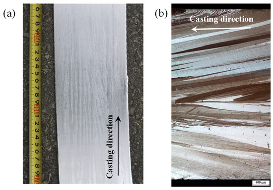 (a) Appearance of pure Al strip fabricated by TRC process, and (b) anodized grain structure of the longitudinal cross-section of the strip.