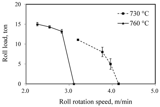 Figure 3 shows the variation in roll load on the TRC sheet under various roll rotation speeds and melt supply temperatures. It can be observed that as the roll rotation speed increases under each temperature condition, the thickness of the solidified shell decreases, leading to a decrease in roll load. The roll load decreases until it approaches zero at a certain speed condition. This indicates that a kiss point is formed at the roll nip, where the thickness of the two roll shells is equal to the initial roll gap. The experimental results indicate that under melt supply temperature conditions of 730 °C and 760 °C, roll loads approached zero at speeds of approximately 4.2 m/min and 3.1 m/min, respectively.