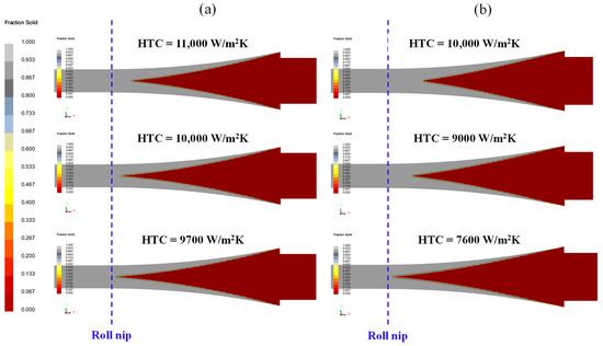 The influence of the roll/melt interfacial HTC on solidification behavior in TRC process, (a) 4.2 m/min and (b) 3.1 m/min.