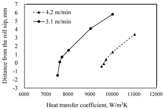 Simulation calculations were performed under roll rotation speed conditions of 4.2 m/min and 3.1 m/min, applying various melt/roll interfacial heat transfer coefficient (HTC) values. Figure 4 illustrates the solidification behavior under different HTC conditions. The simulation results show that as the melt/roll interfacial HTC decreases, the kiss point, where two solidified shells meet, moves toward the roll nip. As mentioned above, experimentally derived conditions of 4.2 m/min and 3.1 m/min exhibit zero value in the roll load. It can be conjectured that in these two experimental conditions, during continuous casting, the kiss point lies at the roll nip. This is because the roll load is imposed as the two solidifying shells expand the roll gap and engage the strip. However, when the two solidifying shells meet at the roll nip, the thickness of the solidifying shells is equal to the initially set roll gap thickness, preventing further expansion of the roll gap, resulting in zero roll load. The derived casting speed conditions represent the onset of roll load reduction toward zero, suggesting that the kiss point is likely positioned at the roll nip at this point. From this perspective, simulation results yielded appropriate HTC values positioning the kiss point at the roll nip. Figure 5 depicts the variation in the position of the kiss point with changes in the HTC. The Y-axis represents the distance between the roll nip and the kiss point in the simulation results, with a negative Y-axis value indicating that the kiss point is forming beyond the roll nip. The appropriate values for the HTC were found to be 9700 W/m²K and 7600 W/m²K for the conditions of 4.2 m/min and 3.1 m/min, respectively, as also shown in Figure 4.