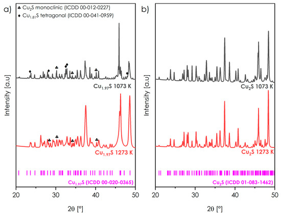 XRD diffraction patterns of copper(I) sulfides obtained by high-temperature reaction between elements and slow-cooled to RT from 1273 K or 1073 K: (a) Cu1.97S, (b) Cu2S.