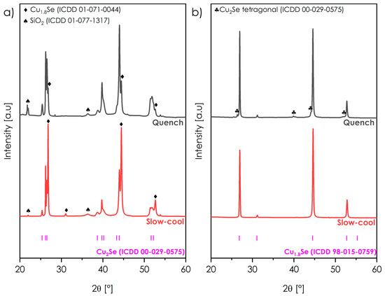 XRD diffraction patterns of copper(I) selenides obtained by high-temperature reaction between elements and slow-cooled or quenched to RT: (a) Cu2Se, (b) C1.8Se.