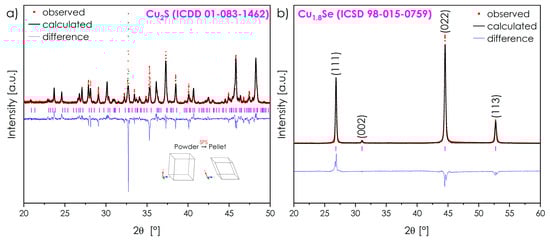 Rietveld analysis of sintered pellets: (a) Cu1.97S; (b) Cu1.8Se.