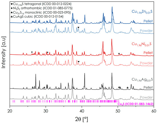 The comparison of powder and sintered pellet XRD diffraction patterns of Cu1.96M0.01S (M = Ag, Ni, Zn).
