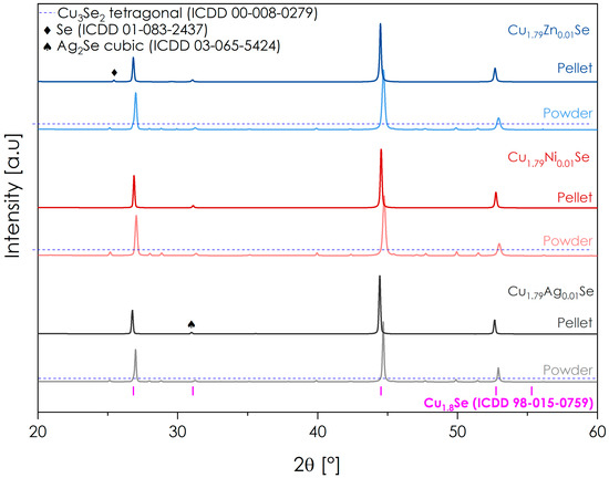 Surprisingly, in the case of selenides, doped materials after synthesis indicate the presence of a cubic Cu1.8Se phase with the additional presence of a residual tetragonal phase with a nominal formula Cu3Se2 (Figure 5). Taking into account the positions of the main reflections from this residual phase, which follow the sizes of individual ions (Ag > Zn > Ni), it can be presumed that this phase is rich in impurities. At the same time, the absence of foreign phases associated with dopant metals can be observed, indicating at least partial dissolution of these dopants in the selenide structure. The same observation can be made on the basis of microstructure observations, where only rare Ag-rich areas can be noticed (Figure S3). The presence of the tetragonal phase diminishes during consolidation processes, confirming phase homogenization during sintering, simultaneously shifting the reflections related to cubic Cu1.8Se noticeably toward lower angles. These shifts can be attributed to several phenomena, starting from the relaxation of the materials during sintering processes to successful doping processes resulting in increased unit cell parameters. Since the potential incorporation of Ni and Zn into β-Cu2Se does not indicate such strong shifts in reflections, especially for Ni doping, which should affect the shifting of analogous reflections toward higher angles [13], another explanation suggests itself. The dopants dissolve in the tetragonal phase, and during the sintering process, they undergo segregation, leading to the homogenization of the main phase into pure-phase Cu1.8Se. Despite the apparent phase homogeneity, processes of segregation of dopant-rich phases can be seen on SEM images. This is particularly evident for the Cu1.79Ag0.01Se pellet, where the diffraction pattern indicates the presence of Ag2Se, also visible in the SEM images (Figure S4). Once again, the only admixture that probably successfully incorporates into the Cu1.8Se structure is Zn.