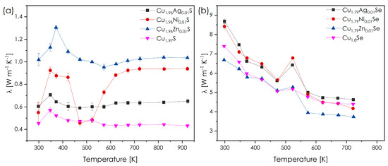 Thermal conductivity of undoped and doped copper chalcogenides as a function of temperature: Cu1.97S (a); Cu1.8Se (b).