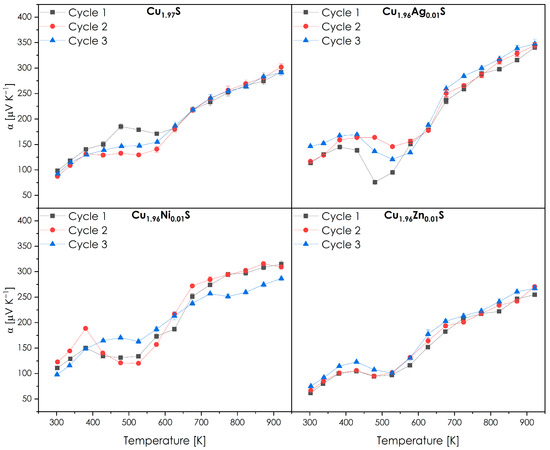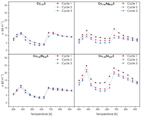 Electrical measurements, including electrical conductivity σ and Seebeck coefficient α, were conducted in a cyclic mode to demonstrate the stability or potential relaxation processes of these materials under operating conditions (Figure 7, Figure 8, Figure 9 and Figure 10). The Seebeck coefficient of undoped Cu1.97S is around 100 µVK−1 at RT and increases to approximately 300 µVK−1 at 900 K, exhibiting two anomalies consistent with phase transitions and characteristic behavior for degenerate p-type semiconductors (Figure 7). These values are slightly lower than those of stoichiometric Cu2S and similar to those obtained in other studies on this material [9,53]. The stability of this material in successive measurement cycles also appears to be good, as indicated by minor deviations in individual measurements as a function of temperature and cycles. The introduction of Ag, Ni, and Zn induces marginal changes in this parameter, both in terms of achieved values and repeatability (Figure 7). The addition of silver slightly increases α, presumably due to a decrease in charge carrier mobility (affected by Ag dopant/Ag-rich phases and increased structure disordering), which, however, was not observed in the work of Yue et al. [38]. An even smaller increase in achieved Seebeck coefficient values is observed for nickel doping. Both of these effects are difficult to classify due to the presence of foreign phases but suggestively are related to a decrease in charge carrier concentration. On the other hand, the presence of metallic segregation or partial dissolution of zinc in copper sulfide leads to a decrease in the observed values of α, presumably due to the opposite effect, namely an increase in charge carrier concentration. A strong effect associated with a phase transition in the temperature range of 400–550 K is not observed in the Seebeck coefficient curves.