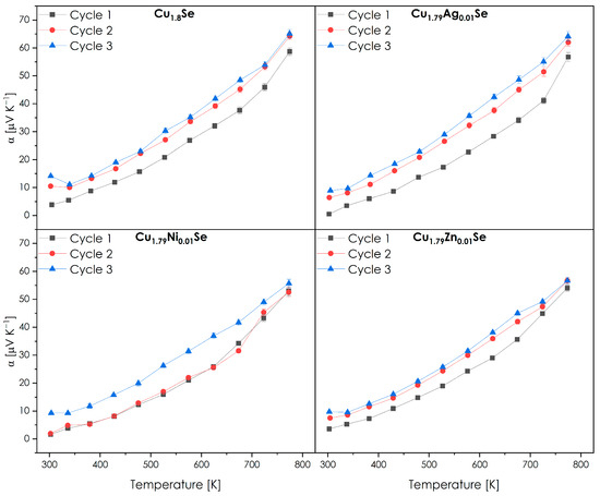Similar to thermal conductivity, the strongly metallic character of copper selenide is also observed in the values of the Seebeck coefficient (Figure 8). This parameter takes values around 10 µVK−1 at RT and increases practically linearly to around 60–70 µVK−1 at 750 K. The presence of dopants and/or additional phases has a similarly marginal effect here, with a tendency for lower α values for doped systems (Figure 8). This may be associated with both an increase in charge carrier concentration and further defect formation in the cationic sublattice with successive measurement cycles, suggesting significantly lower stability of Cu1.8Se than Cu1.97S. Once again, this result contradicts literature reports, where zinc or nickel dopants result in an increase in recorded Seebeck coefficient values [13,54]. However, there is a possibility that this slight decrease should be correlated with an increasing contribution of minority charge carriers. Nickel and zinc can act as electron donors here, masking the effects related to total Seebeck coefficient values.