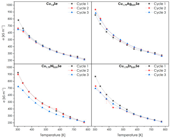 The electrical conductivity σ of Cu1.97S systems (Figure 9) reaches values around 104 Sm−1 with a clear tendency to decrease in the temperature range of 400–600 K, corresponding to the presence of the Cu1.96S phase with a tetragonal structure [9]. In the case of undoped material, the electrical conductivity is a repeatable value in successive measurement cycles, with a slight tendency to improve this parameter. The electrical conductivity curve of Ni-doped material exhibits a similar trend. However, the addition of silver and zinc significantly deteriorates the σ of these materials with successive measurement cycles (Figure 9). This is interesting because there is no simultaneous increase in the Seebeck coefficient, which may have several reasons. The first is the dissolution of the dopants during measurements, leading to a decrease in charge carrier mobility. However, a more probable explanation is the further segregation of foreign phases, which does not affect the recorded values of α but affects the conductivity abilities, for example, through precipitation and partial oxidation of metal-rich phases at grain boundaries. The possibility of decreased electrical conductivity in subsequent cycles could also be attributed to charge accumulation at the grain boundaries, which is caused by the significant ionic contribution to electrical conductivity. Still, the electrical conductivity recorded in the presented study is one order of magnitude higher than those shown by Yue et al. [38]. We do not observe such effects in the case of Cu1.8Se selenide (Figure 10). The strongly metallic character of these materials (doped and undoped) is evident here, with achieved values on the order of 105 or even 106 Sm−1 at RT and a typical decrease in conductivity with increasing temperature, which is a characteristic of metals. These results are significantly higher than those presented by various dopants (including Ni and Zn) in β-Cu2Se [13] and nearly twice the values of those presented by Nieroda for the stoichiometric Cu2Se obtained via the hydrothermal method [11]. It is worth noting the slightly higher conductivity values for Ni-doped Cu1.8Se compared to the undoped system, which is unusual considering that nickel should be a donor dopant. This situation is most likely associated with the increased charge carrier concentration provided by the dopant as well as the presence of metallic precipitates at grain boundaries. The differences in recorded values between individual measurement cycles are negligible for all considered compositions.