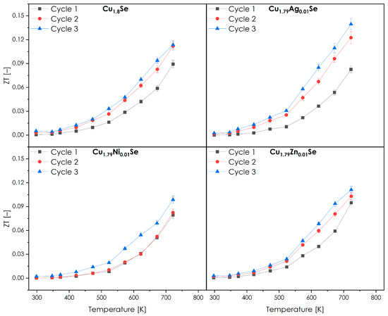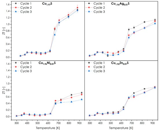 After combining the above-described transport properties, the ZT parameter was determined as a function of temperature and individual measurement cycles (Figure 11 and Figure 12). For sulfides, the highest recorded value of about 1.5 is achieved by undoped Cu1.97S at 923 K, which stays in line with available literature data [9,56] (Figure 11). All introduced dopants lead to a significant deterioration of this parameter, with minor changes in the profiles over individual cycles. An exception is the Ni dopant, for which a nearly half reduction in ZT is noticed in the third cycle compared to the first one, primarily due to the recorded Seebeck coefficient values, particularly in the high-temperature ranges. This result also contradicts similar systems, where the addition of Ni, whether incorporated or precipitated as a foreign phase, consistently leads to an increase in the final ZT values [36].
