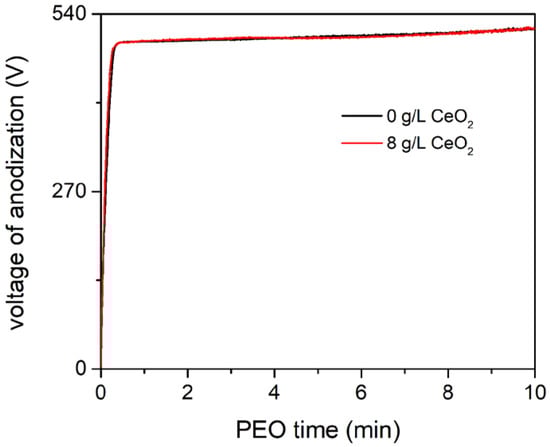 Figure 1 illustrates the voltage–time characteristics observed during the anodization process of AZ31 magnesium alloy in a solution containing 5 g/L NaAlO2, both with and without the addition of 8 g/L CeO2 particles. As shown, the inclusion of CeO2 particles did not produce any noticeable impact on the voltage–time curves, with two distinct regions being identifiable. The first region is linked to classical anodization and the formation of a thin dense oxide layer, characterized by an almost linear rise in voltage. The second region is correlated with dielectric breakdown of the formed compact oxide layer, indicated by a noticeable deviation from the linearity of the voltage–time curve and the occurrence of numerous micro-discharges.
