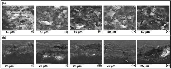(a) Top view and (b) cross-section micrographs of coatings formed in 5 g/L NaAlO2 by adding CeO2 particles in concentrations of (i) 0 g/L; (ii) 1 g/L; (iii) 2 g/L; (iv) 4 g/L; (v) 8 g/L.