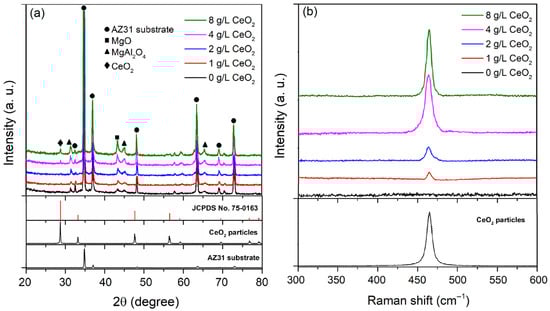 (a) XRD patterns and (b) Raman spectra of coatings formed in 5 g/L NaAlO2 with varying concentrations of CeO2 particles.