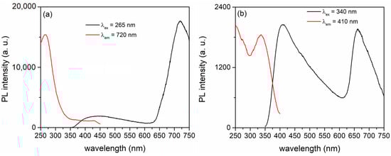 PL excitation and emission spectra of MgO/MgAl2O4 coatings: (a) λex = 265 nm, λem = 720 nm; (b) λex = 340 nm, λem = 410 nm.