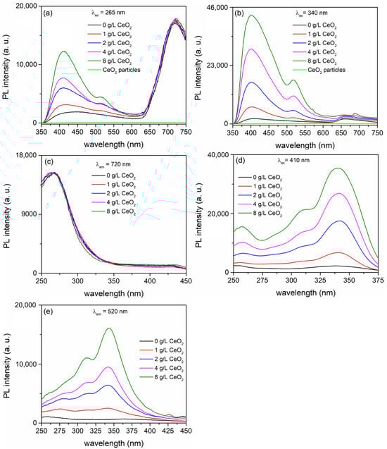 PL spectra of MgO/MgAl2O4/CeO2 coatings formed in 5 g/L NaAlO2 with varying concentrations of CeO2 particles: (a) emission spectra excited at 265 nm; (b) emission spectra excited at 340 nm; (c) excitation spectra monitored at 720 nm; (d) excitation spectra monitored at 410 nm; (e) excitation spectra monitored at 520 nm.