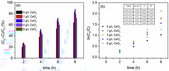 Figure 6a illustrates how the concentration of CeO2 particles in the electrolyte affects the MO photodegradation efficiency using the formed coatings. C0 is the initial concentration of MO, and its concentration at time t is C. For every CeO2 concentration, three samples were examined, and the mean values are displayed in Figure 6a. Samples collected under identical conditions have a very high reproducibility (within 3%) for the PA. The concentration of CeO2 particles added to the electrolyte affects the PA of the MgO/MgAl2O4/CeO2 coatings, which is significantly higher than that of MgO/MgAl2O4 coatings. The highest PA of MgO/MgAl2O4/CeO2 coatings was achieved with the addition of 2 g/L of CeO2 particles.