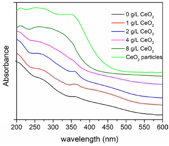 The UV–Vis DRS spectra of CeO2 particles and the formed coatings are shown in Figure 7. A broad absorption band in the mid-UV region is typical for MgO/MgAl2O4 formed in an aluminate electrolyte []. The used CeO2 particles have an absorption band edge at approximately 440 nm. Due to the low concentration of CeO2 in the formed coatings, the shift in the absorption curves towards the visible region is insignificant, especially for low concentrations of CeO2 particles in the electrolyte (1, 2, and 4 g/L). This indicates that the increased PA of MgO/MgAl2O4/CeO2 coatings compared to MgO/MgAl2O4 coatings is due to a decrease in photogenerated electron/hole recombination rate as a result of MgO/MgAl2O4 and CeO2 coupling.