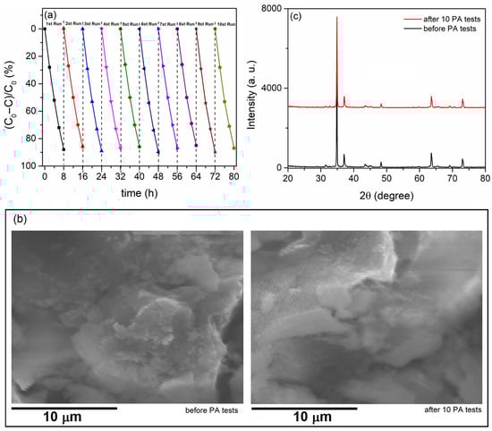 Ten consecutive photocatalytic tests were conducted on the most active photocatalyst in order to investigate the potential application of MgO/MgAl2O4/CeO2 coatings in photocatalysis. Figure 8 shows the recycling test of MO photodegradation along with the morphology and composition before and after 10 runs. The morphology, composition, and PA did not change, indicating that the produced photocatalyst exhibited a high degree of chemical and physical stability.