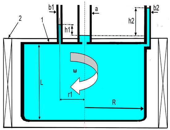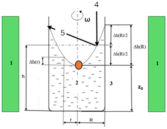 The form of the free surface of the rotated melt is a paraboloid if the Lorence Force (F.L.), which produces the rotation, is constant along the radius; then, the liquid’s viscosity and the wall friction can be negligible, and the aspect ratio (h/2R) can be higher than 6. In this case, the angular velocity (ω) is constant along the radius. To measure the fall in the original surface in the centre of the paraboloid (red circle and Δh/2 in Figure 1) [31], the calculation can be carried out as follows: