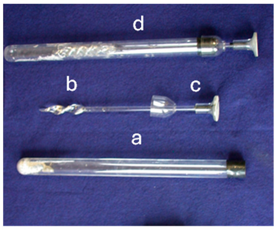 Glass ampulla (a) and glass “turbine” (b), “shaft + turbine blade” (b and c), and complete measuring unit (d)