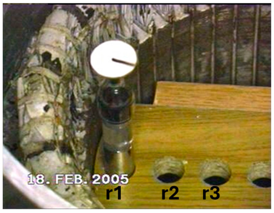 In [23], a “turbine” was made that consisted of a glass ampoule (a) containing liquid Ga and a “turbine blade” (b) formed at the higher end of a glass shaft that was immersed into liquid Ga (version A). The bearing of the “shaft + turbine blade” was placed into the cap, closing the top of the glass ampoule (Figure 2). The rotating liquid Ga rotated the shaft. The Rpm of the turbine was determined by evaluating the video film taken of the marked disc located on the upper part of the shaft. (Figure 3). By placing the small turbine into the holes, which are the different distances from the wall of the inductor, the ω value can be measured as a function of r. In a bigger crucible (Figure 4), the turbine blade could be placed at a different radius r (r1, r2 and r3) or height, so ω can be mapped in the hole crucible.