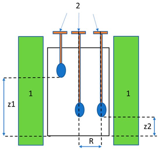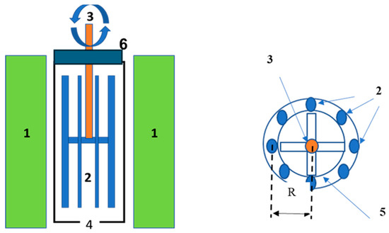 In [21], another type of “turbine” was used (Figure 5) (version B). One turbine consists of 8 blue rods (turbine blade, 2) fixed on a wheel and (5) immersed in the mercury melt in a glass crucible (4). The radius (R) of the fixing wheel is changeable, so the Rpm is measurable at a different distance from the centre. The rotation of the shaft (3) is used to measure the Rpm.