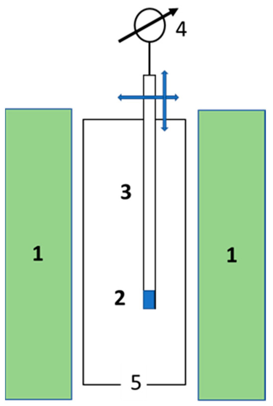 The conductive anemometer is made from a thin ceramic tube (3 in Figure 6) [22]. A longitudinally magnetised permanent magnet is mounted at one end of the tube (2). Electrodes made from copper wire are mounted at the two opposite sides of the magnet and aligned along its axis. The induced voltage is measured using a nano-voltmeter (4). The ceramic tube is fixed in the holder of the traverse gear and can move along the radial and axial (blue arrows). The facility must calibrate with the mechanically rotated melt with different angular velocities.