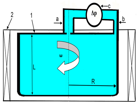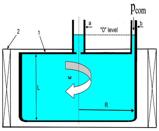 The crucible is closed with two gauges connections to measure the pressure at r = R [24]. The gauges at the tank’s axis (r = 0) and periphery (R) are labelled, respectively, “a” and “b” in Figure 7A. The two gauges connections and crucible are a “communication vessel”. The melt level is the same as that at the gauge connections if the RMF inductor is not operated. Moreover, the atmospheric pressure is identical in the so-called “stationary-level” or “0-level” gauge connections.