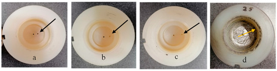 Four crucibles with 2 mm diameter holes. The distances from the axis are (a) 5 mm, (b) 7.5 mm, (c) 10 mm, and (d) 12.5 mm. The black and yellow arrows show the holes.