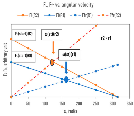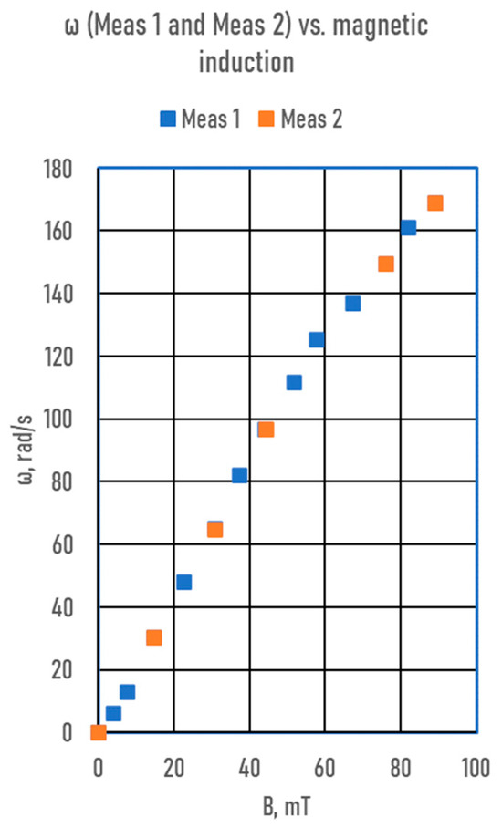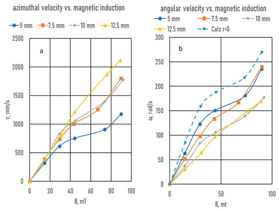 In Figure 22, the angular and azimuthal velocities are shown in a wide range of magnetic inductions at five different radiuses. It can be seen that ωmax = 314 rad/s can be reached using about 200 mT at r = 5 mm, while at r =12.5 mm, about 800 mT is needed. It must be mentioned that the curves are verified in the range of magnetic induction between 0 and 90 mT, and from 90 to 800 mT, only the estimation is based on the measured data.