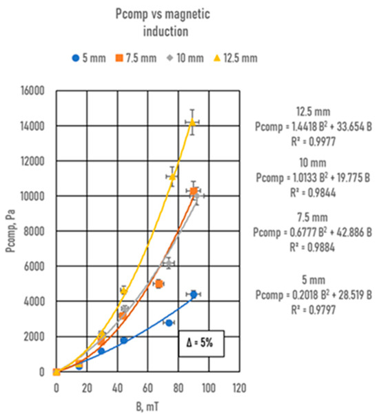 Figure 14 and Table 3 show the measured pcomp as a function of magnetic induction at the four different radiuses. A quadratic equation can well describe the measured values. The measuring error (Δ) is less than 5%.