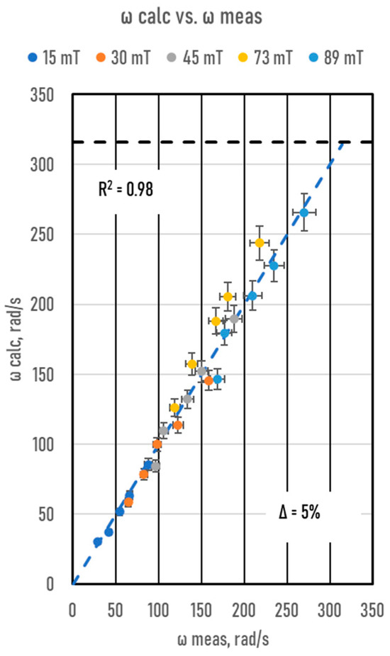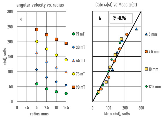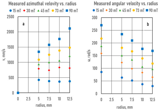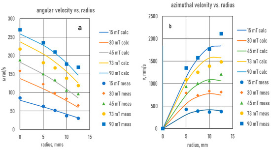 In Figure 20a,b, the measured and calculated angular and azimuthal velocities are compared as functions of the radius at the five magnetic inductions. In Figure 21, all measured and calculated angular velocities are compared. Based on these figures, it can be stated that with Equation (19), the angular velocity is calculatable with acceptable error (R2 = 0.98) as a function of the radius and magnetic induction, which is usable in the simulation software.